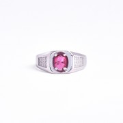 This distinguished 925 sterling silver ring for men features a prominent oval-cut central stone in a deep, rich crimson hue, reminiscent of a regal ruby or vibrant tourmaline. The striking red gem is framed by polished silver and flanked on either side by intricate pavé-set sparkling accents, adding a touch of brilliance and sophistication. The bold and solid band tapers gracefully, ensuring a comfortable fit while maintaining its masculine appeal. This ring is a timeless piece that combines classic design with modern flair, perfect for the man who appreciates strong, statement-making jewelry.