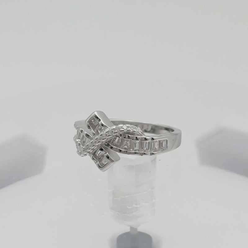 The epitome of modern glamour, This ring is a chic and sophisticated statement piece. This beautiful ring is designed as a stylized, glittering bow, with two sweeping ribbons of flawless, channel-set baguette crystals that flash with an icy, linear light. Tying them together is a delicate, contrasting knot of brilliant, round pavé stones. The stunning interplay of light and texture makes this 925 sterling silver ring a true masterpiece of celebratory elegance.
