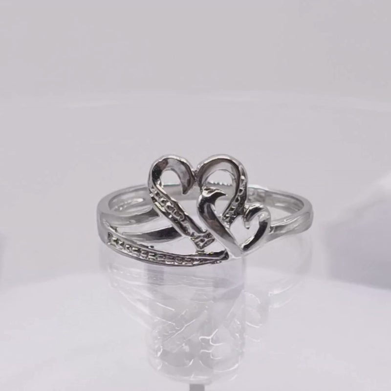 Discover the perfect harmony of romance and elegance with this beautiful 925 sterling silver ring. The design features a pair of intricately crafted, interlocking hearts at its center, symbolizing eternal love and connection. On one side, a graceful curve of pavé-set stones adds a subtle touch of sparkle, catching the light with every movement. This ring is a blend of classic romance and modern sophistication, making it an ideal piece for both daily wear and special occasions. The polished finish ensures a lasting shine, making it a cherished addition to any jewelry box.