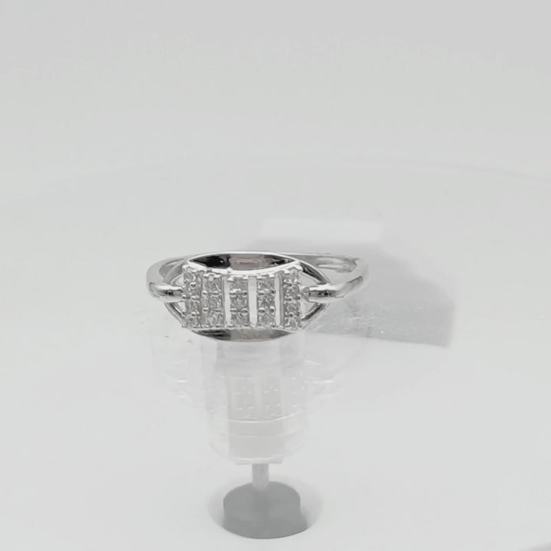 A beautiful example of modern, architectural design, This ring is a study in sophisticated sparkle. This unique piece features an elegant, eye-shaped silhouette crafted from polished 925 sterling silver. At its center, a delicate cage of four vertical, crystal-set bars glitters with every movement of your hand. The airy, openwork design makes this a chic and understated statement for the woman with a keen eye for detail and contemporary style.