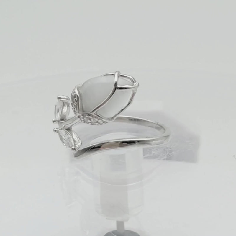 Like a delicate whisper from an enchanted garden, This ring is a tribute to graceful, natural beauty. This exquisite open-ended ring features a single, perfect flower bud crafted from a luminous, moonstone-like stone that glows with an ethereal, milky light. The bud rests in a sparkling, crystal-set cup, while two glittering marquise-cut leaves adorn its sterling silver vine. It's a truly romantic and whimsical piece, designed to capture the magic of a bloom at dawn.