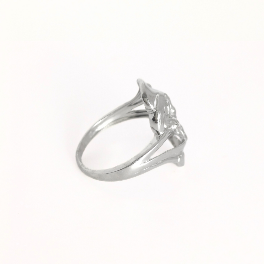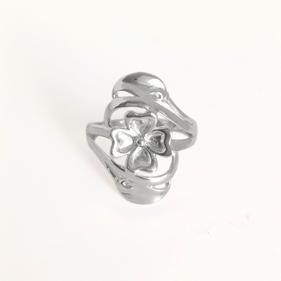 This charming ring features a delicate clover or floral design, crafted from high-quality 925 sterling silver. The central motif, with its four stylized petals, adds a touch of nature-inspired elegance to the piece. The ring's unique, flowing design creates a sculptural and eye-catching silhouette. The polished sterling silver finish enhances the ring's intricate details, making it a beautiful and meaningful accessory. This ring is perfect for those who appreciate feminine and symbolic jewelry.