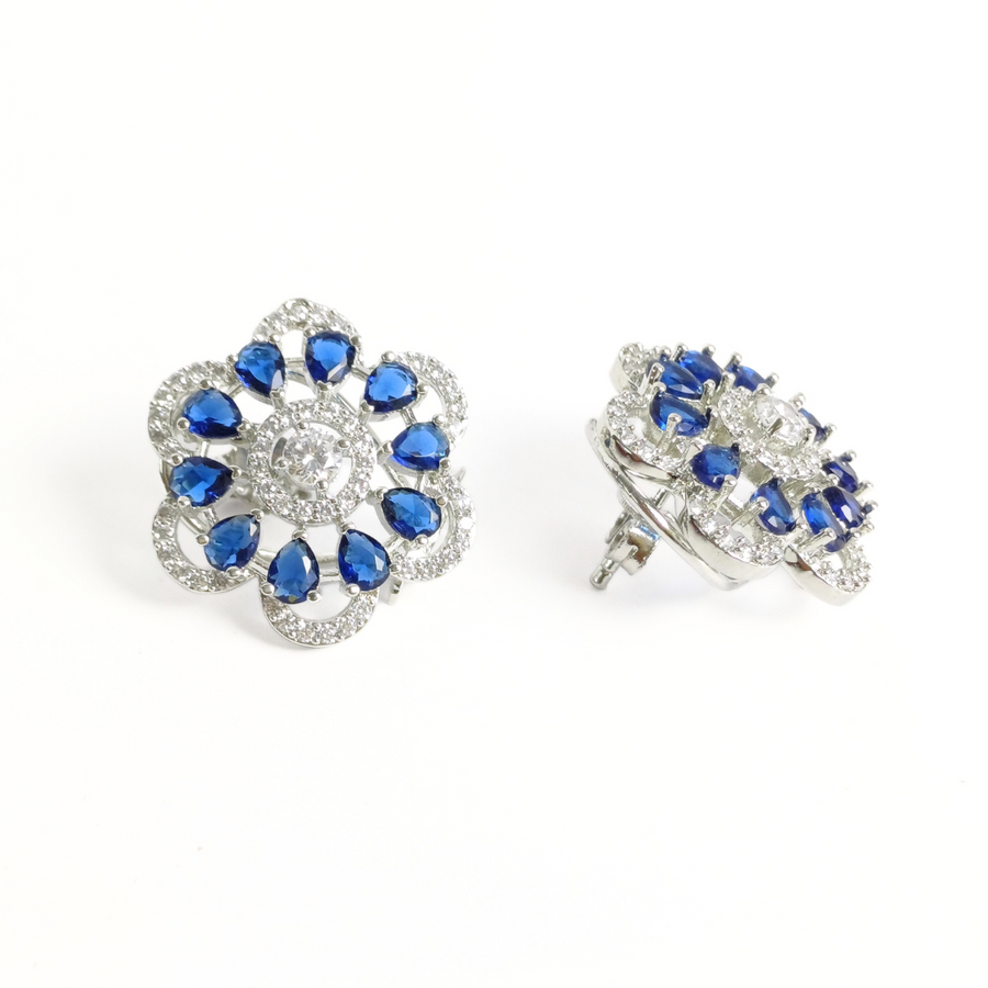 These exquisite stud earrings feature a captivating floral design, meticulously crafted from high-quality 925 sterling silver. Each earring showcases a cluster of vibrant blue teardrop-shaped gemstones, forming delicate petals around a central clear gemstone. The surrounding halo of sparkling clear gemstones adds a touch of brilliance and enhances the overall elegance of the design. The unique double lock closure ensures extra security and comfort, making these earrings perfect for all-day wear and special occasions. The intricate detailing and vibrant gemstones make these earrings a stunning addition to any jewelry collection.